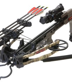This ready-to-hunt crossbow package includes an Illuminated Reticle/speed adjustable scope, 3 BearX TrueX Max arrows, a 4-arrow top-mount quiver, sling, manual cocking sled, and arrow lube/string wax